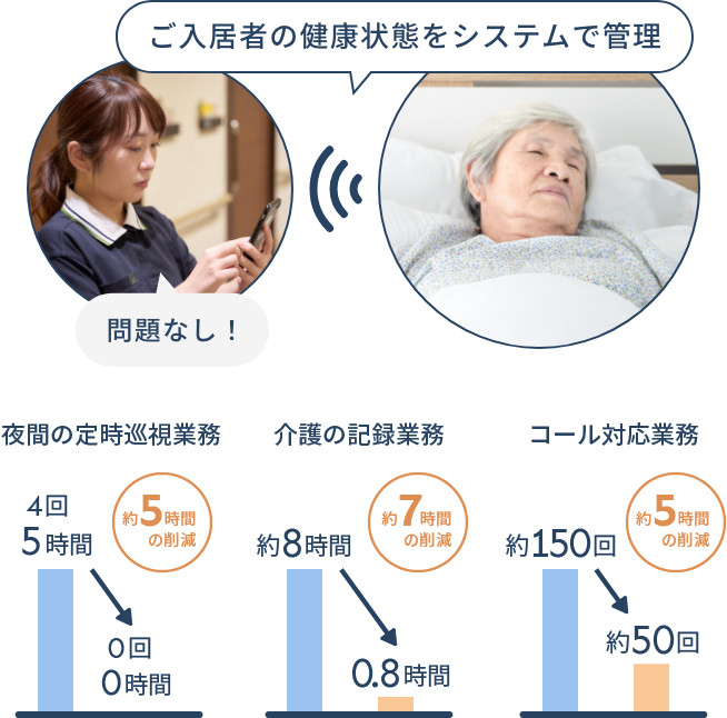スマホアプリとBluetoothイヤホンを組み合わせることで、距離無制限のグループ通話が行えるシステム。情報共有がスピーディになることで、ご入居者への適切な処置・ケアを行えるようになりました。